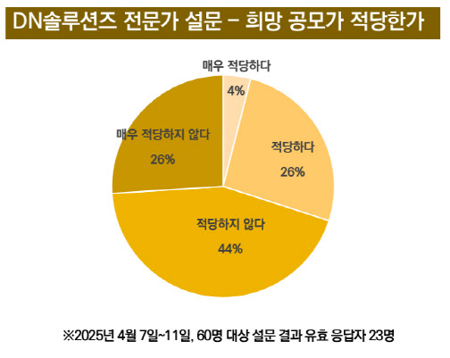 하지만 시장참여자들은 DN솔루션즈의 공모가 수준이 여전히 ‘높다’고 판단했다. 공모가가 합리적이지 않다고 본 가장 큰 이유로 ‘주가수익비율(PER) 멀티플 25.18배는 너무 높게 책정됐다’가 꼽혔다. 공모가 수준이 적절하지 않다고 답한 응답자 중 절반에 가까운 42%가 멀티플을 문제삼은 것이다.