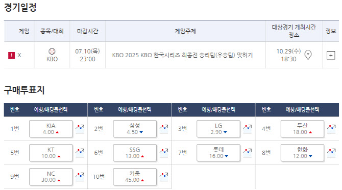 스포츠토토는 작년에 이어 올해도 오는 7월 10일 오후 11시까지 한국시리즈 최종전 맞히기 상품(KBO 스페셜 기록식 25회차 X게임)을 발매한다. 작년에 발매기간이 약 1개월이었던 점을 감안하면 올해는 약 4개월로, 약 4배 정도가 늘어난 셈이다.