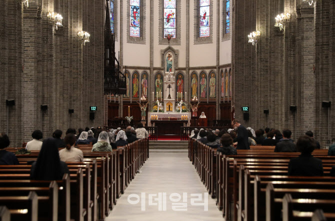 [이데일리 김태형 기자] 22일 오전 서울 중구 명동성당에서 신도들이 프란치스코 교황을 위해 기도하고 있다.
