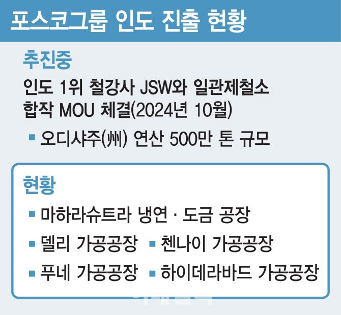 포스코는 현재 마하라슈트라 180만톤(t) 규모의 냉연·도금 공장을 포함해 델리, 첸나이 등 5개 철강 가공공장을 운영하고 있다. 철광석을 녹여 쇳물을 만드는 상공정과 철강 제품을 만드는 하공정까지 모두 갖춘 일관제철소를 짓는 것은 이번이 처음으로, 포스코가 보유한 해외 일관제철소는 인도네시아, 중국, 베트남 등 3곳 뿐이다.