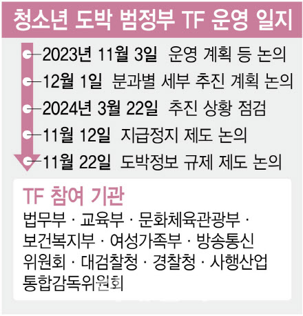 윤석열 대통령이 “청소년을 대상으로 한 불법 도박 개장은 국가의 미래를 좀먹는 악질 범죄”라고 언급하면서 출범한 이 범정부 TF는 법무부·교육부·문화체육관광부·보건복지부·여성가족부·방송통신위원회·대검찰청·경찰청·사행산업통합감독위원회(사감위)등 9개 기관이 참여했다. 이를 통해 청소년 도박 근절 정책의 우선순위를 정하고 이를 유기적으로 운영하자는 취지였다.