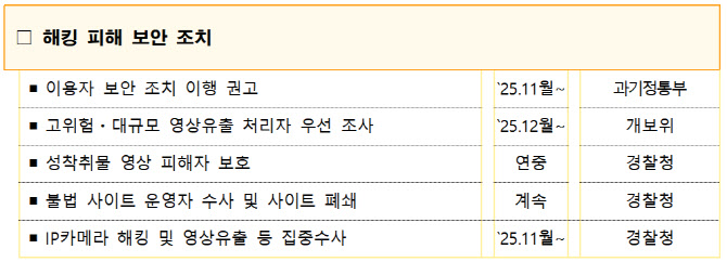 또 해킹 피해자들을 보호하기 위해 △성착취물 영상 삭제·차단 △피해자 법률·의료·상담 지원 △고위험·대규모 영상유출 사업장에 대한 개인정보보호법 위반 여부 우선 조사 △IP카메라 해킹 및 영상유출과 불법 촬영물 등 성착취물 영상 판매 등의 범죄에 대한 수사를 강화하기로 했다.