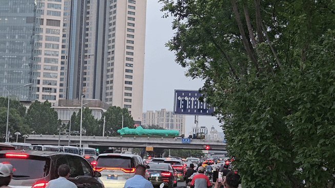 도로 위편 고가에서도 중국군 차량이 모습을 드러냈다. 불편을 호소하던 사람들은 일제히 몰려들어 지나가는 중국군 장비의 사진과 영상을 찍었다.