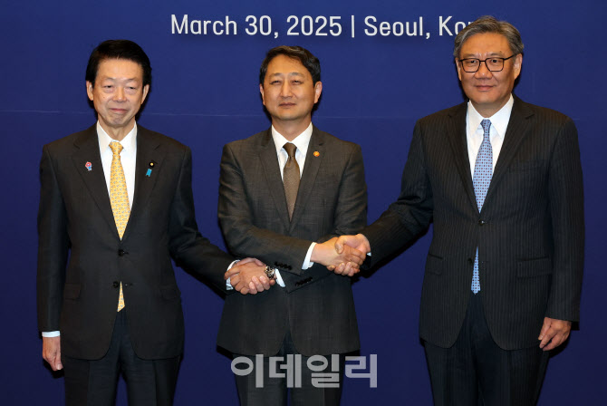 [이데일리 방인권 기자] 안덕근 산업통상자원부 장관(가운데)과 무토 요지 일본 경제산업상(왼쪽), 원타오 중국 상무부 부장(오른쪽)이 30일 서울 중구 대한상공회의소에서 열린 '제13차 한·일·중 경제통상장관 회의'에서 기념촬영을 하고 있다.