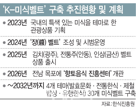 K-미식벨트는 이러한 한식의 글로벌 확산 흐름을 국내 관광과 지역 경제 활성화로 연결하기 위한 전략적 시도이기도 하다. 농식품부와 한식진흥원은 2024년부터 K-미식벨트 사업을 본격 가동하고 ‘발효문화, 전통한식, 제철밥상, 유행한식’ 등 4대 테마를 중심으로 2032년까지 총 30개의 미식관광 권역을 구축할 계획이다.