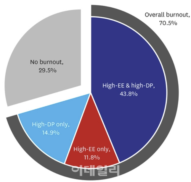 특히 둘 다 점수가 높은 경우도 전체 응답자의 43.8%(200명)에 달했다. 정서적 소진이 높은 경우는 55.6%(254명), 이인증은 58.6%(268명)이었다.