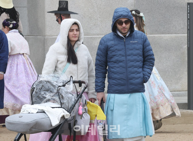 [이데일리 이영훈 기자] 전국 대부분 지역에 강한 바람이 불고 최저 영하 1도까지 내려가는 등 꽃샘추위가 이어진 30일 서울 종로구 경복궁에서 외국인 관광객들이 관람하고 있다.