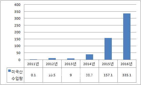 이는 2011년 한미 자유무역협정(FTA) 발효와 함께 최근 미국 셰일가스 개발 확대에 따른 변화로 풀이된다. FTA 발효 전인 2011년 2100만달러(1000t)에 불과했던 미국산 LPG 수입 규모는 작년 12억2000만달러(335만1000t)로 금액은 58배, 물량은 무려 3351배 증가했다. 향후 양국간 교역 구조의 균형을 맞추는 역할을 할 수 있을 것으로 기대된다.