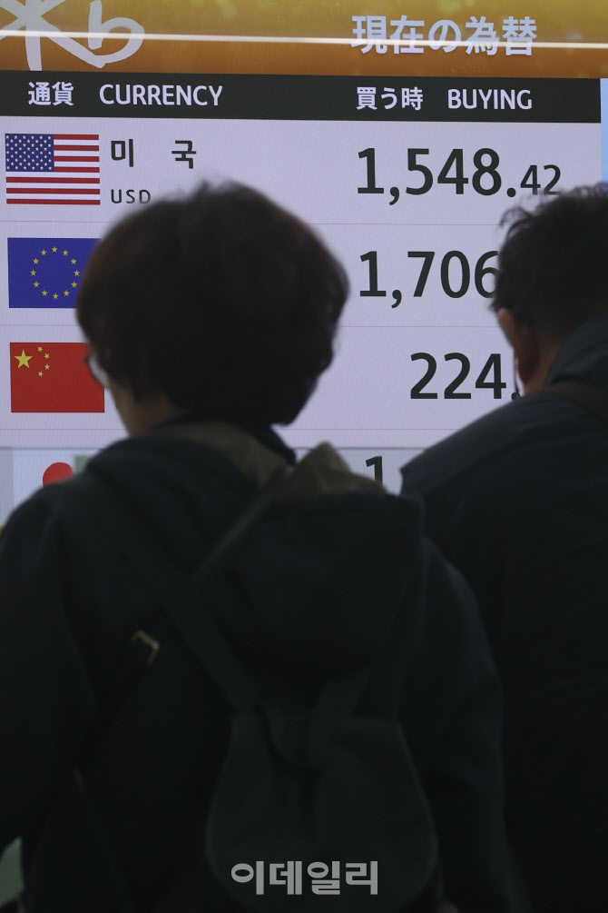 [이데일리 이영훈 기자] 미국 관세 정책 불확실성 속에 1,480원대 후반까지 치솟는 가운데 9일 오후 인천국제공항 2터미널에서 한 여행객이 환전을 하고 있다.