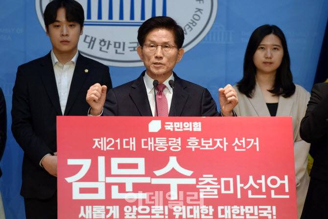 [이데일리 노진환 기자] 김문수 전 고용노동부 장관이 9일 서울 여의도 국회 소통관에서 제21대 대통령선거 출마 선언을 하고 있다.