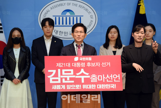 [이데일리 노진환 기자] 김문수 전 고용노동부 장관이 9일 서울 여의도 국회 소통관에서 제21대 대통령선거 출마 선언을 하고 있다.