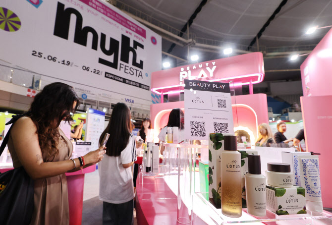 지난달 19일 서울 송파구 올림픽공원 핸드볼경기장에서 열린 2025 마이케이 페스타(MyK FESTA)를 찾은 외국인이 전시된 화장품을 살펴보고 있다. (사진=연합뉴스)