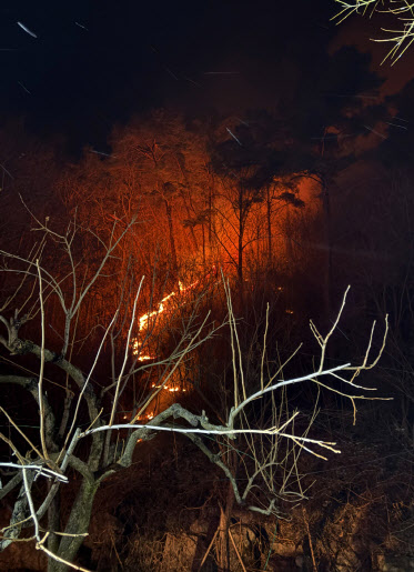 [대전=이데일리 박진환 기자] 김인호 산림청장은 23일 전남 곡성에서 발생한 산불이 조기진화 될 수 있도록 가용가능한 자원을 최대한 투입해 총력 대응할 것을 지시했다. 이번 산불은 22일 오후 9시 13분경 전남 곡성군 오산면 선세리 일원에서 발생했다. 야간에 발생한 산불은 험난한 지형과 기온의 급강하로 진화작업에 어려움을 겪고 있다.