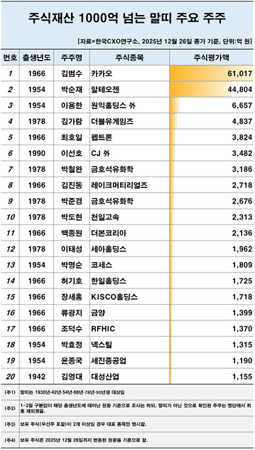 아울러 지난 26일 기준 주식평가액이 100억원이 넘는 말띠 주주는 85명으로 나타났다. 출생연도별로 살펴보면, 1966년생이 34명(40%)으로 가장 많았다. △1954년생(30명, 35.3%) △1978년생(16명, 18.8%) △1942년생(3명, 3.5%) △1990년생(2명, 2.4%)이 뒤를 이었다.