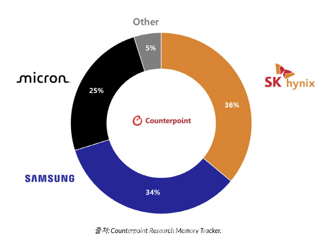 9일 글로벌 시장조사업체 카운터포인트리서치에 따르면 올해 1분기 글로벌 D램 시장에서 SK하이닉스가 점유율 36%를 차지했다. 이어 삼성전자가 34%, 마이크론이 25%순이었다.