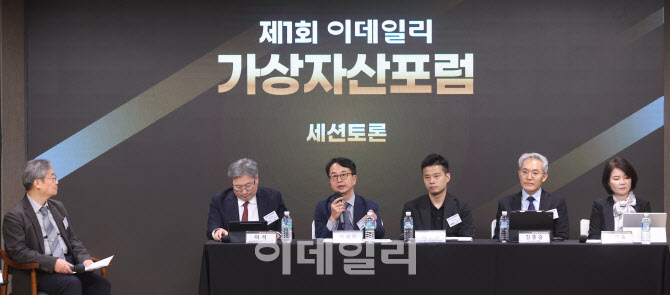 [이데일리 이영훈 기자] 박용범 단국대 교수, 이석 금융감독원 가상자산감독국 국장, 이해붕 업비트 투자자보호센터장, 서병윤 DSRV랩스 미래금융연구소장, 김종승 xCrypton 대표, 서은숙 상명대학교 교수가 11일 서울 중구 순화동 KG타워에서 열린 '제1회 이데일리 가상자산포럼'에서 '법인 가상자산 투자 허용에 따른 국내 시장 대응법' 주제로 토론을 하고 하고 있다.