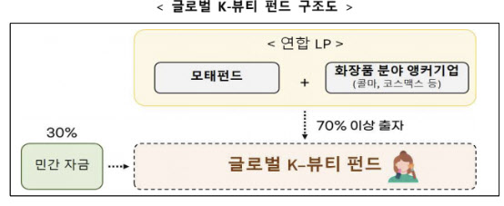K뷰티 펀드는 민·관이 함께 만드는 최초의 뷰티 전용 벤처펀드로 코스맥스와 한국콜마, 모태펀드가 공동 출자해 400억원 규모로 조성한다. 민·관 합동 ‘스타트업 코리아 펀드’의 일환으로 마련된 K뷰티 펀드는 모태펀드가 30%, 민간 기업이 40%, 위탁운용사(GP)가 30%를 각각 출자한다. 코스맥스와 한국콜마는 각각 80억원(40%, 총 160억원)을 투입해 개별 펀드를 조성하며 GP 결성 규모에 따라 펀드 규모는 400억원 이상으로 확대될 수 있다. 중기부는 오는 5월 GP 모집을 공고하고 오는 9월 결성을 완료한다는 목표다.