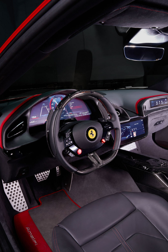 실내는 듀얼 콕핏 구조를 기반으로 운전자와 동승자의 공간을 명확히 구분했다. 고객 요청에 따라 물리 버튼이 복귀했고 중앙 대시보드에는 수평형 터치스크린을 배치해 두 공간을 자연스럽게 연결했다. 이는 페라리의 철학인 ‘눈은 도로에, 손은 스티어링에’를 그대로 구현한 것이다.