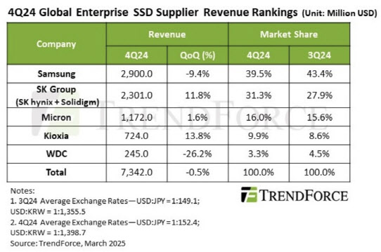 삼성전자는 4분기 매출 29억달러를 기록하며 시장 점유율(39.5%) 1위를 유지했지만, 전분기 대비 9.4%의 매출 감소를 기록했다. SK하이닉스(솔리다임 포함)는 매출 23억달러로 같은 기간 11.8% 증가했다. 점유율도 27.9%에서 31.3%로 3.4%포인트 상승했다.