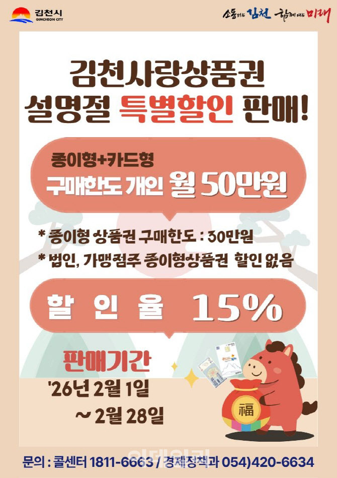 김천시 관계자는 “김천사랑상품권 할인 판매가 설 명절 소비를 촉진하는 마중물 역할을 할 것”이라면서 지역 소상공인과 시민들을 위해 다양한 민생경제 활성화 방안을 추진하겠다”고 말했다.