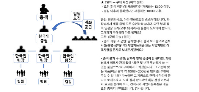 조직의 범행 수법은 치밀했다. 피해자들을 속이기 위해 단계별 범행 계획이 적힌 대본을 준비했다. 철물점을 운영하는 한 자영업자의 피해 사례를 보면, 1차 유인책이 군 부대 장교를 사칭해 전동 드릴 구매 의사를 밝힌다. 유인책은 국방부 명의 위조 공문을 제시하며 피해자의 신뢰를 얻었다. 이어 피해자에게 군부대에서만 사용하는 질식소화포를 특정 업체를 통해 구해줄 수 있는지 문의했다. 2차 유인책은 질식소화포 업체로 위장해 피해자에게 연락한 뒤, 시세보다 저렴하게 판매할 것처럼 속였다. 피해자가 대금을 입금하면 조직원들은 연락을 끊고 잠적했다.