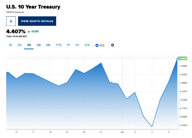미 국채금리는 지난주만해도 광범위한 트럼프 관세 정책으로 경기침체 우려가 커지면서 급격하게 떨어졌다. 투자자들이 위험자산인 주식을 팔고 안전자산으로 꼽히는 미 국채 매수에 나선 영향도 있었다. 그러다 지난주 월요일부터 사흘간 빠르게 치솟는 상황이다. 국채금리가 더 떨어질 것이라는 예상과 완전 다른 움직임이 나타나고 있는 상황이다.