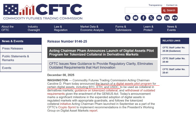 | | 미국 상품선물거래위원회(CFTC) 캐롤라인 D. 팜 의장대행은 8일(현지시간) “미국 파생상품 시장에서 비트코인과 이더리움을 포함한 토큰화된 담보를 위한 미국 디지털자산 파일럿 프로그램을 출범한다”고 밝혔다. (자료=CFTC) |