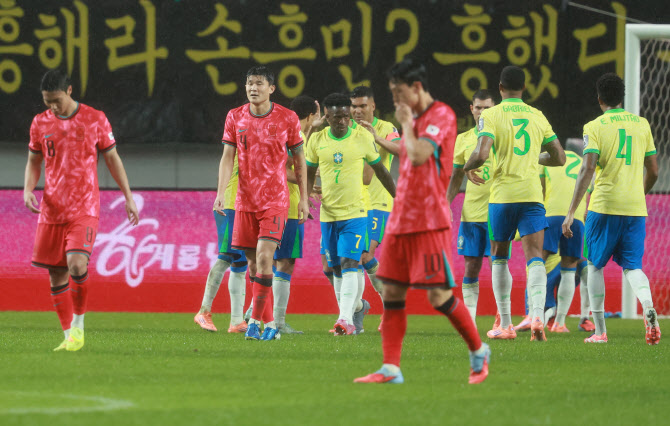 | | 10일 서울 마포구 서울월드컵경기장에서 열린 한국과 브라질 축구 대표팀의 친선경기. 한국 선수들이 추가 실점한 후 아쉬워하고 있다. 사진=연합뉴스 |