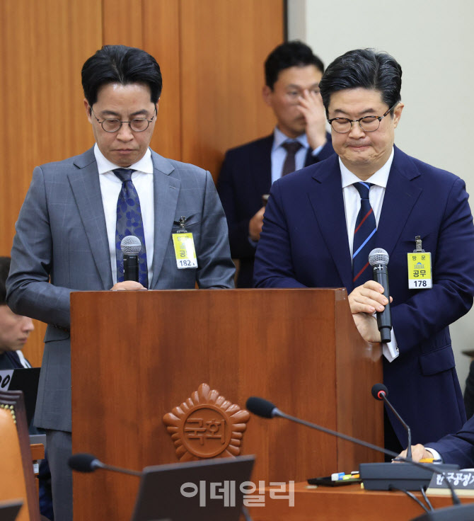 조좌진(왼쪽) 롯데카드 대표이사와 김병주 MBK파트너스 회장이 지난달 14일 국회에서 열린 정무위원회의 공정거래위원회 등에 대한 국정감사에 증인으로 출석, 의원 질의를 듣고 있다. [사진=이데일리 노진환 기자]