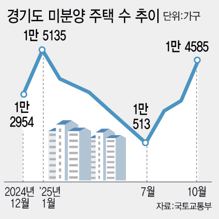 16일 국토교통부에 따르면 경기도 미분양 주택은 10월말 1만 4585가구로 작년말(1만 2954가구) 대비 12.6%, 1631가구 증가했다. 수도권을 제외한 지방의 미분양 주택은 이 기간 5만 3176가구에서 5만 1518가구로 3.1%, 1658가구 감소한 것과 대조된다.
